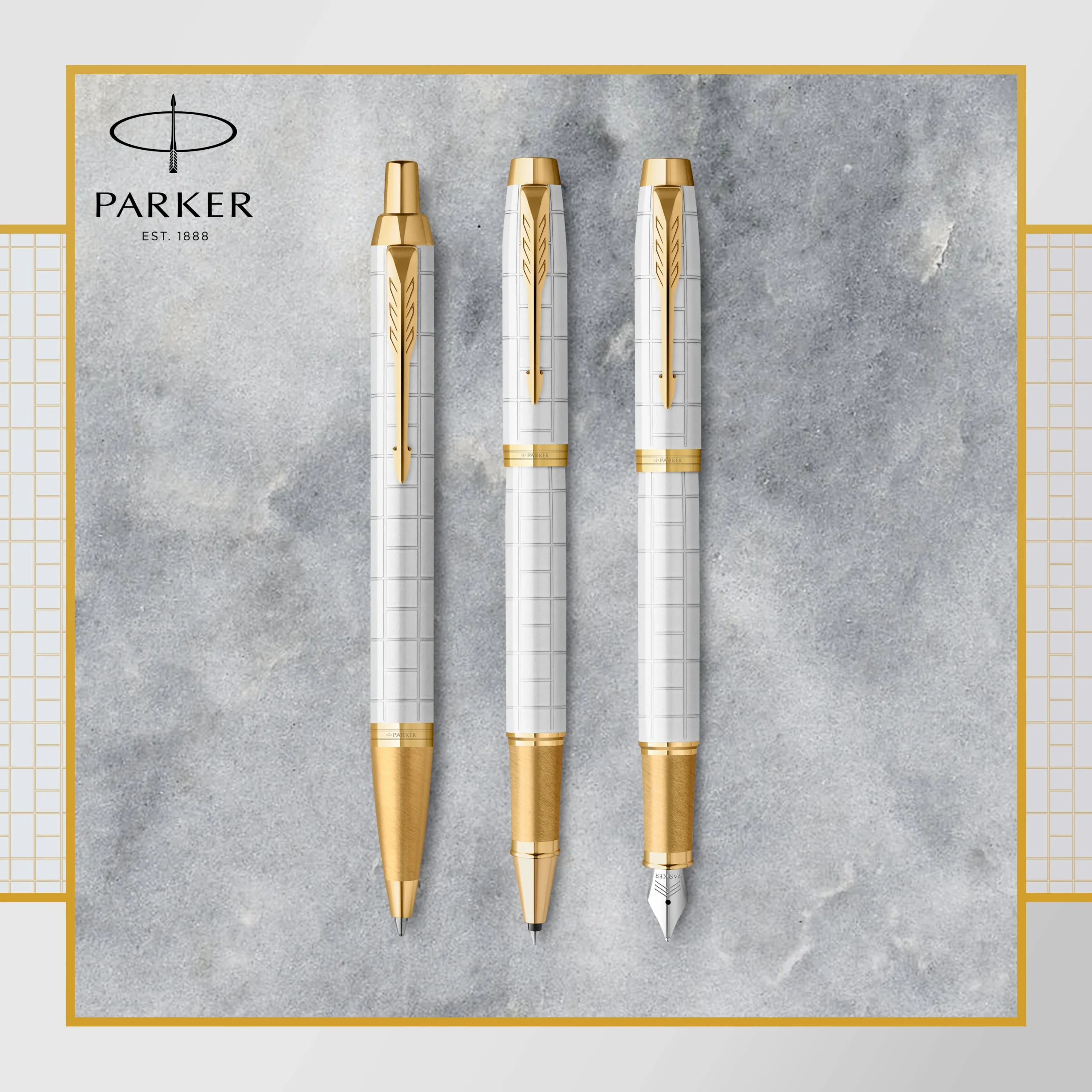 Elegante pearl gelakte behuizing gegraveerd met een modern asymmetrisch vierkant motief, gecomplementeerd door een gouden afwerking en de kenmerkende PARKER-pijlclip