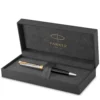 De Sonnet Metal & Black is de klassieke versie van een verfijnde stijl en elegantie. Deze heeft een zwarte opake lak met glanzende geverniste, vergulde afgewerkte details en een 18k massief gouden penpunt bedekt met een rodium afwerking. De geëtste dop heeft een gedetailleerd diamantpatroon dat zorgt voor verfijning bij iedere schrijfgelegenheid.